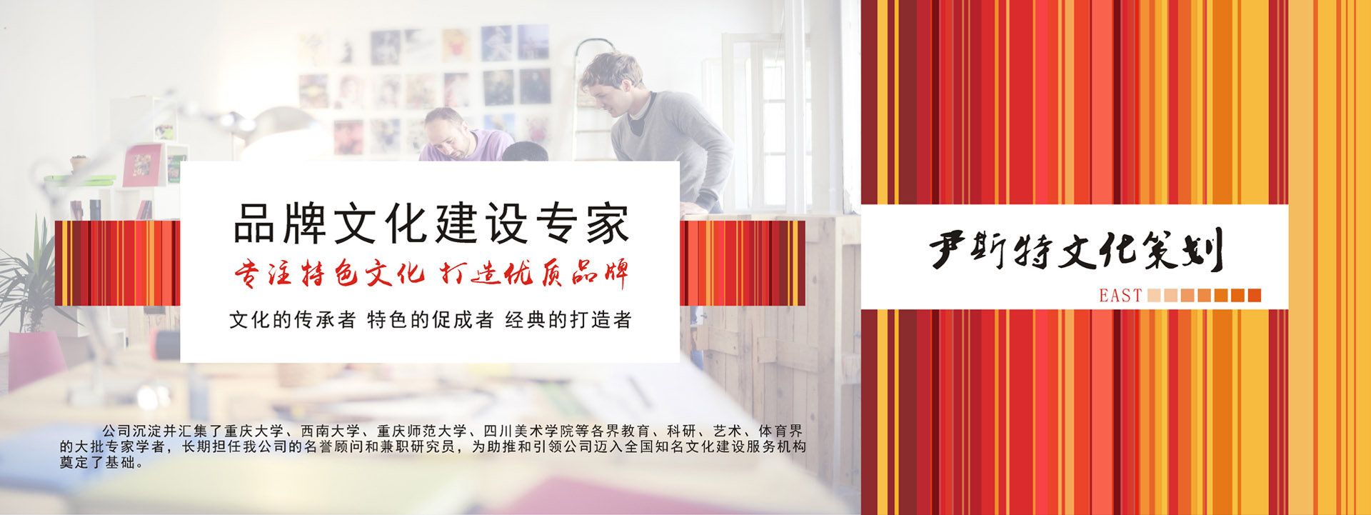 重慶尹斯特文化傳播有限公司全體同仁堅守“文化的傳承者,特色的促成者,名企的打造者”的服務(wù)宗旨,齊心協(xié)力,不斷進(jìn)取,攜手為西部乃至全國的企業(yè)策劃和企業(yè)文化建設(shè)事業(yè)作出新的貢獻(xiàn)。